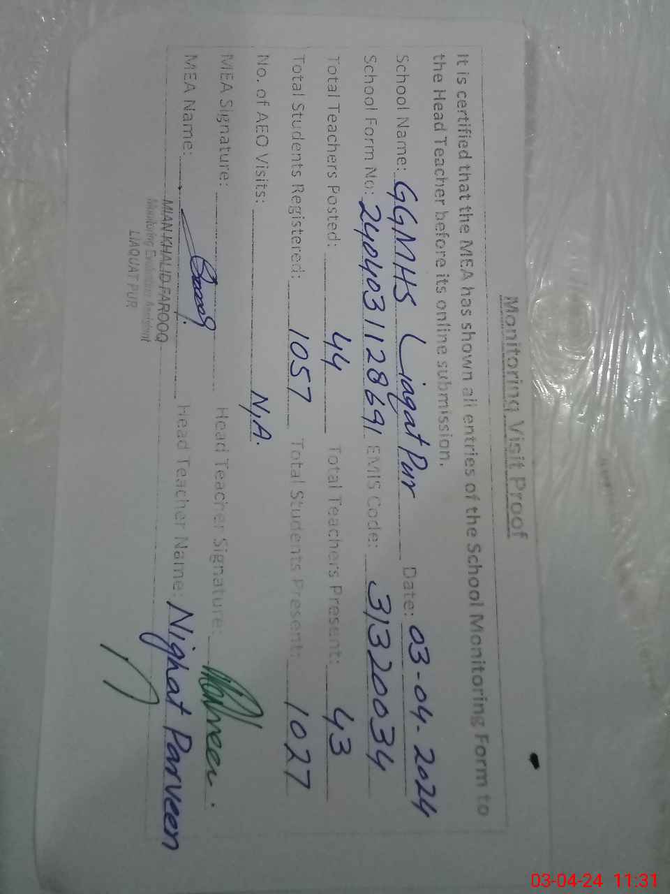 | EMIS Code: 31320034 | Name of School: GGHS MODEL LIAQAT PUR | |||
