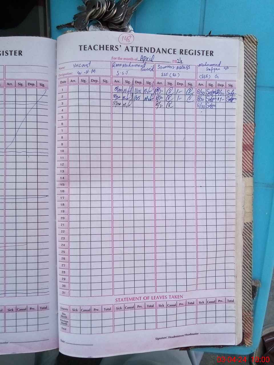 | Leave | Duty | Absent | Maternity | Medical | Ex- Pak |