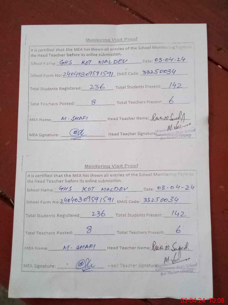 | Attendance Register | Head Teacher | MEA with School | Visit Proof |