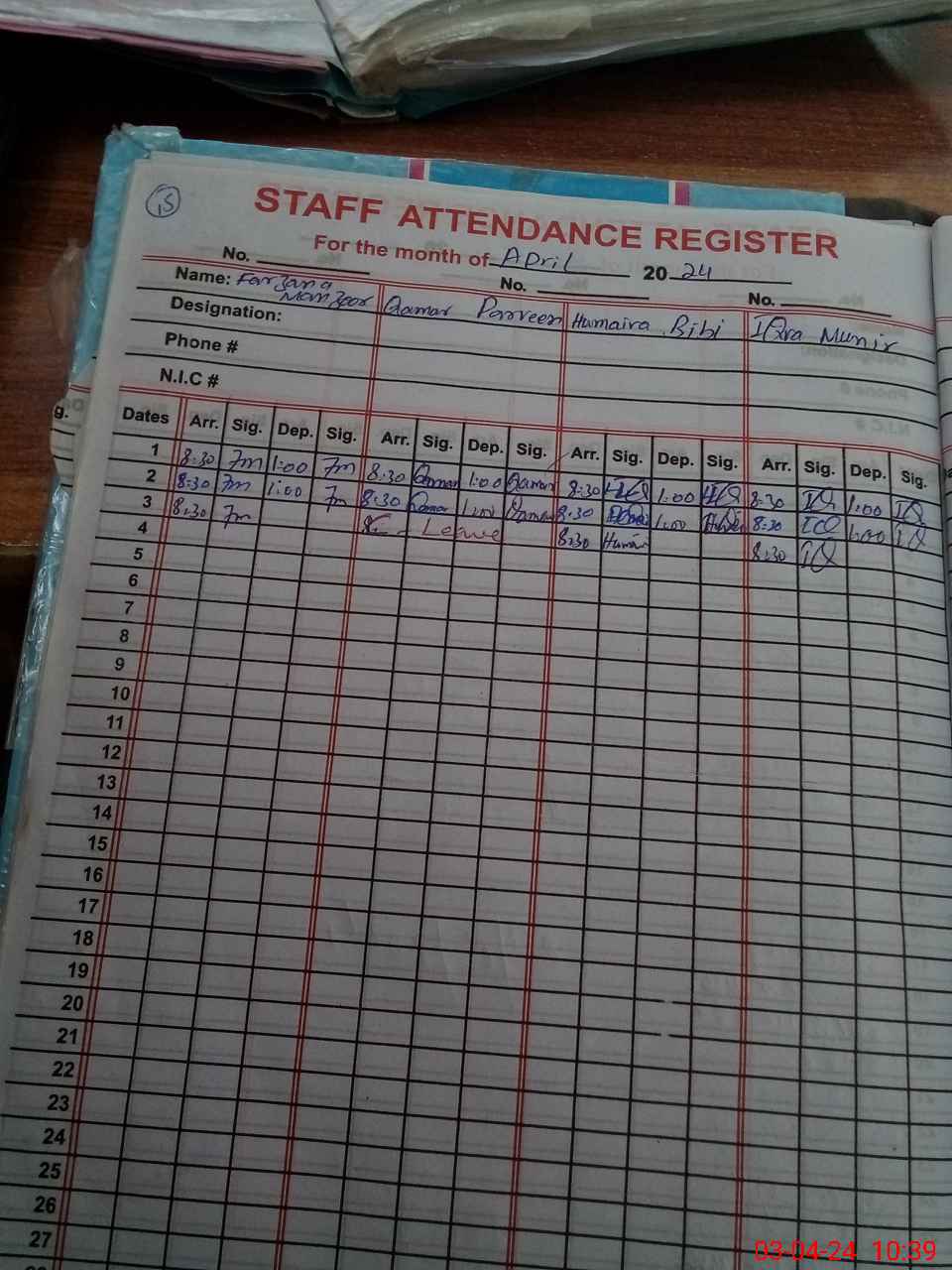 | CNIC | Full Name | Designation | R/C | Absence During Last Calender Month |