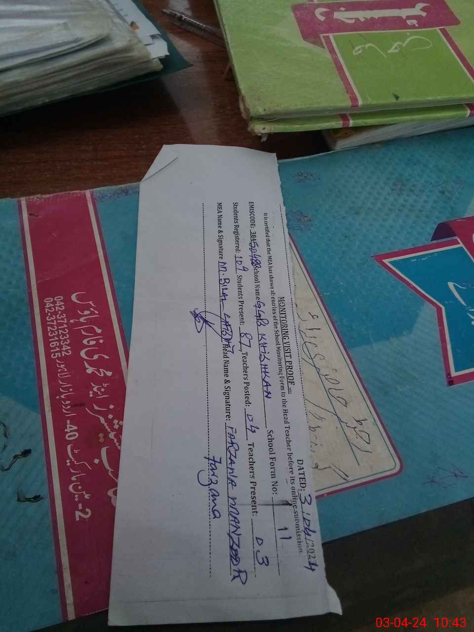 | Name: FA**** MA**** Designation: (School Headmaster's/Headmistress's) PTC/JV Phone/Cell Number: 03**** |