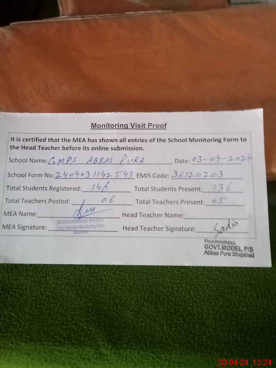 | EMIS Code: 36120203 | Name of School: GMPS ABBAS PURA | |||