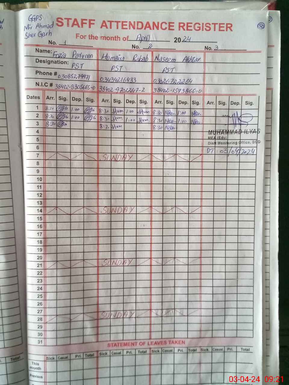 | Name: AY**** MA**** Designation: (School Headmaster's/Headmistress's) PST Phone/Cell Number: 03**** |