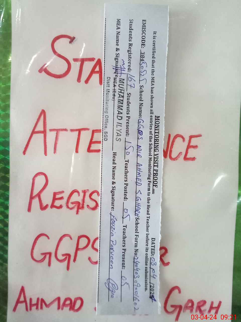 | Attendance Register | Head Teacher | MEA with School | Visit Proof |
