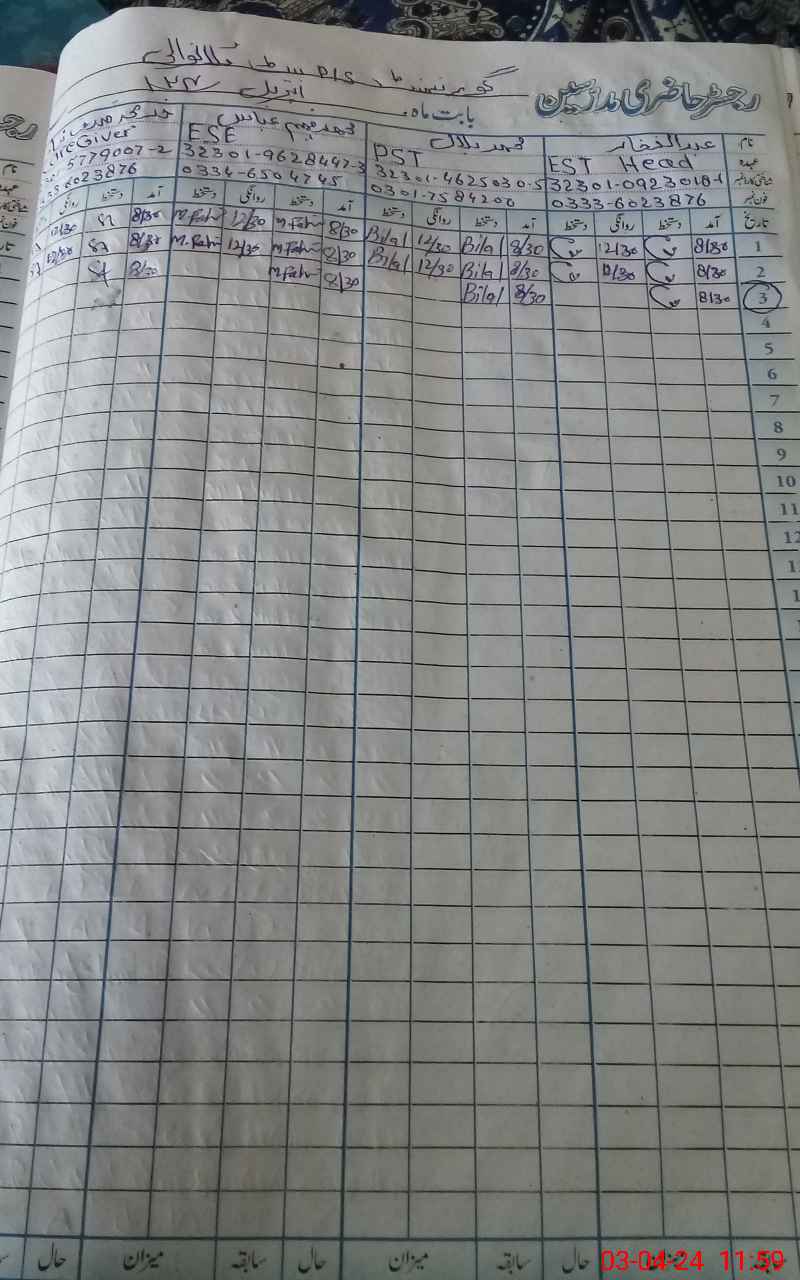 | CNIC | Full Name | Designation | R/C | Absence During Last Calender Month |