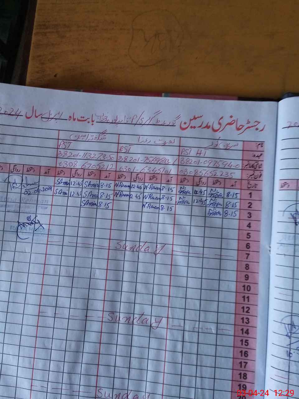 | CNIC | Full Name | Designation | R/C | Absence During Last Calender Month |