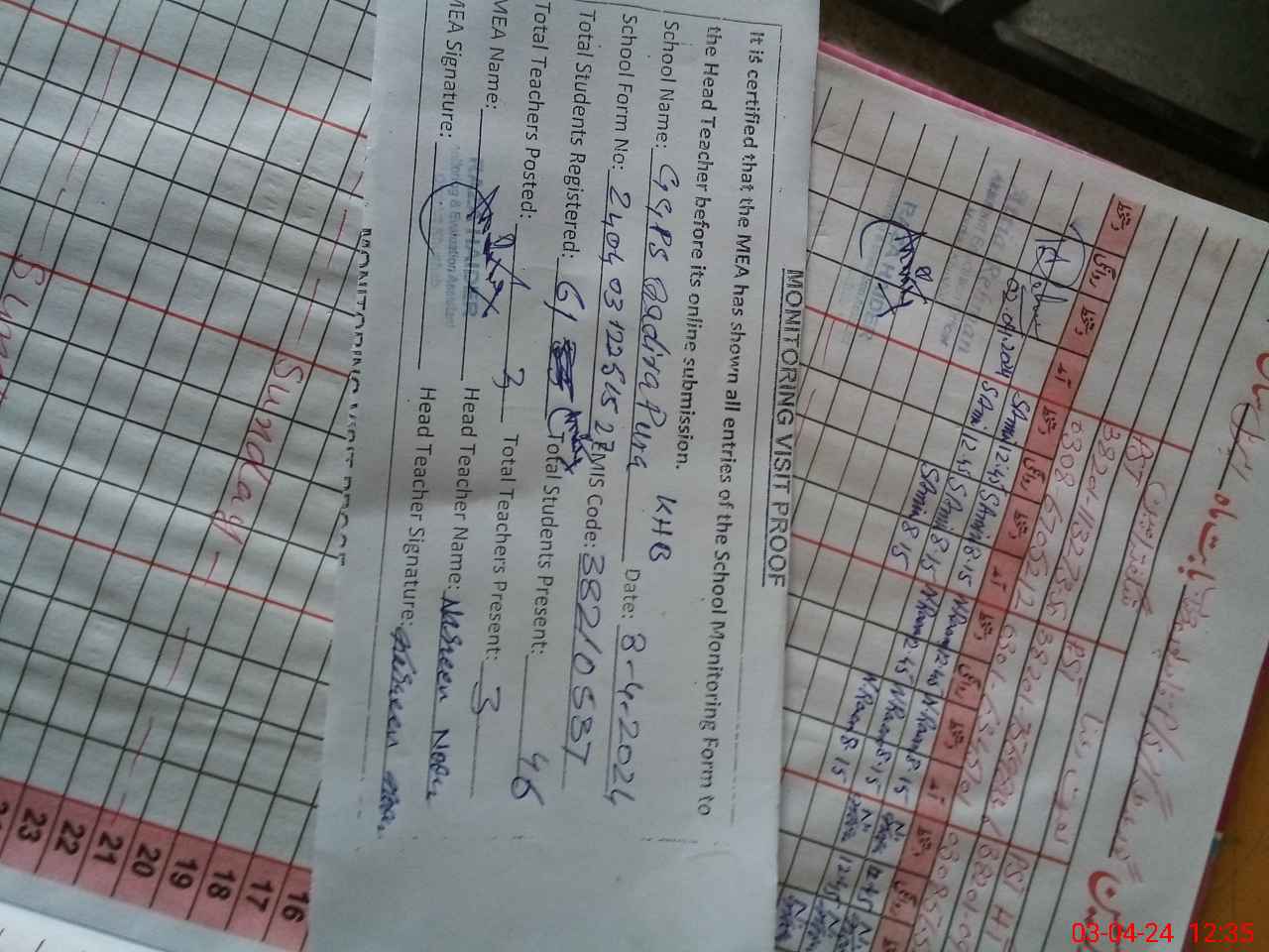 | Attendance Register | Head Teacher | MEA with School | Visit Proof |
