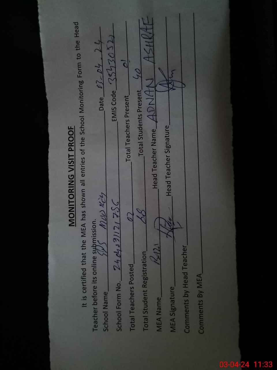| Attendance Register | Head Teacher | MEA with School | Visit Proof |