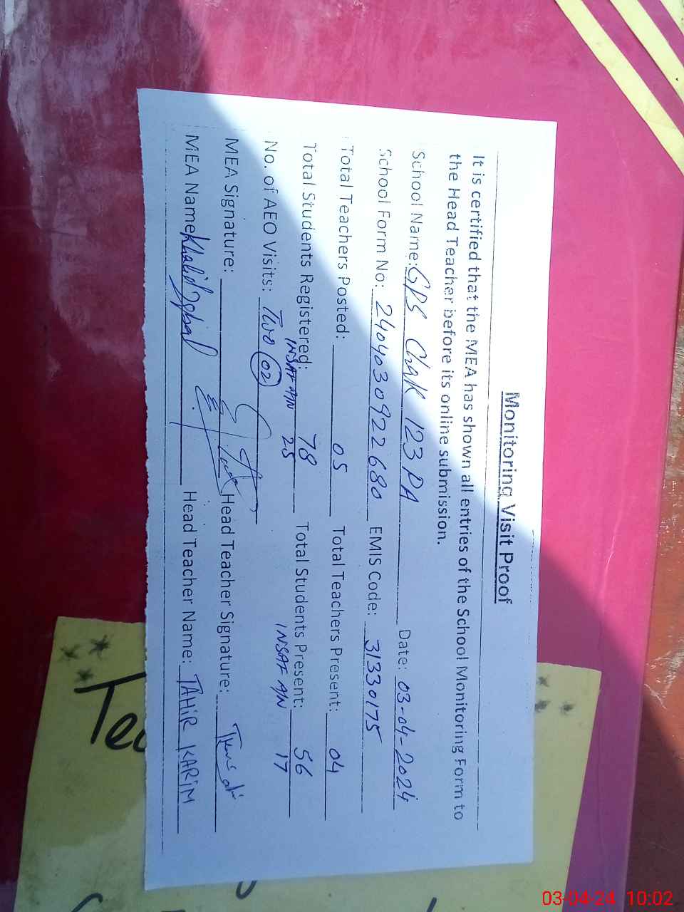 | Attendance Register | Head Teacher | MEA with School | Visit Proof |