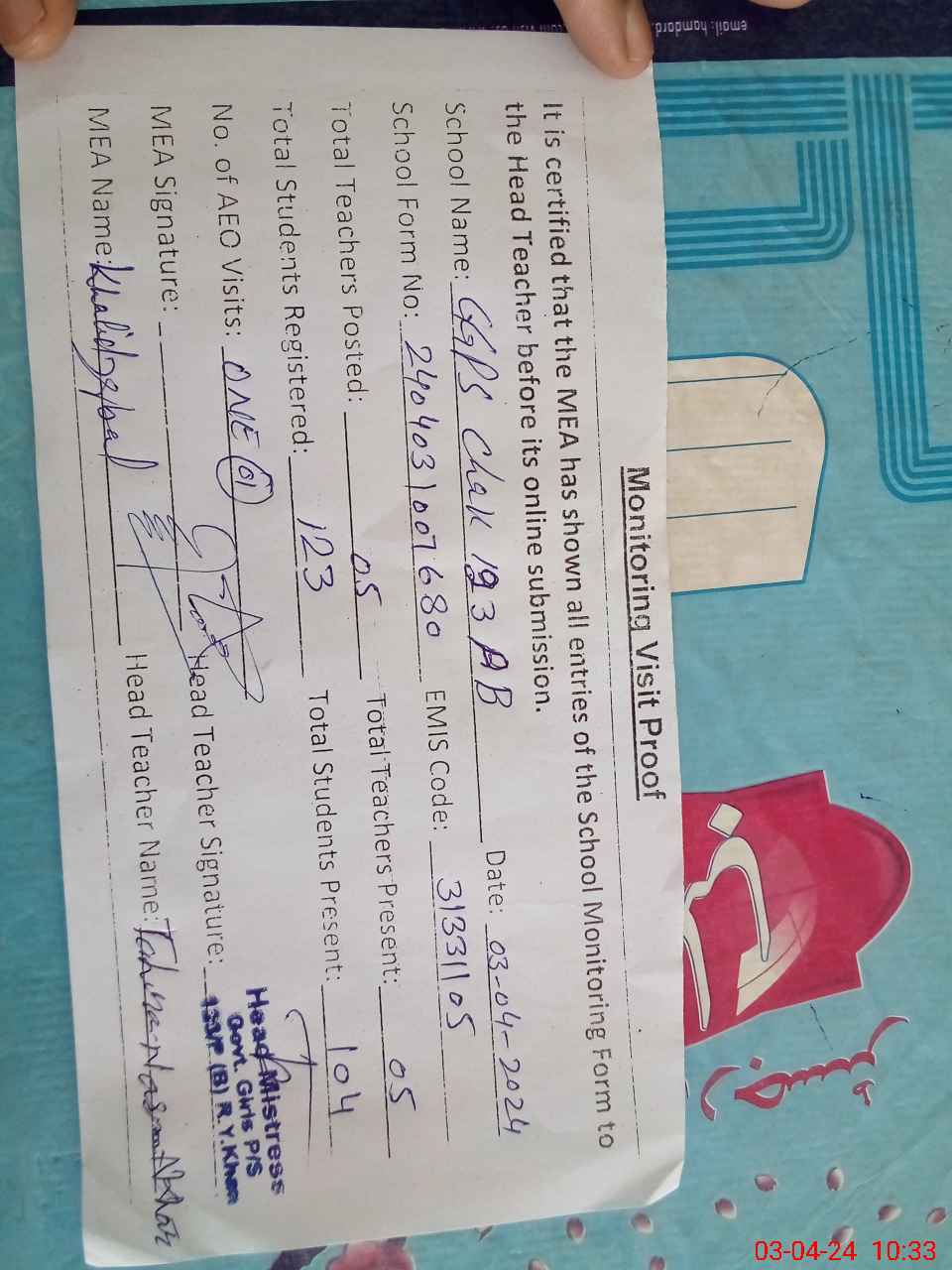 | Attendance Register | Head Teacher | MEA with School | Visit Proof |
