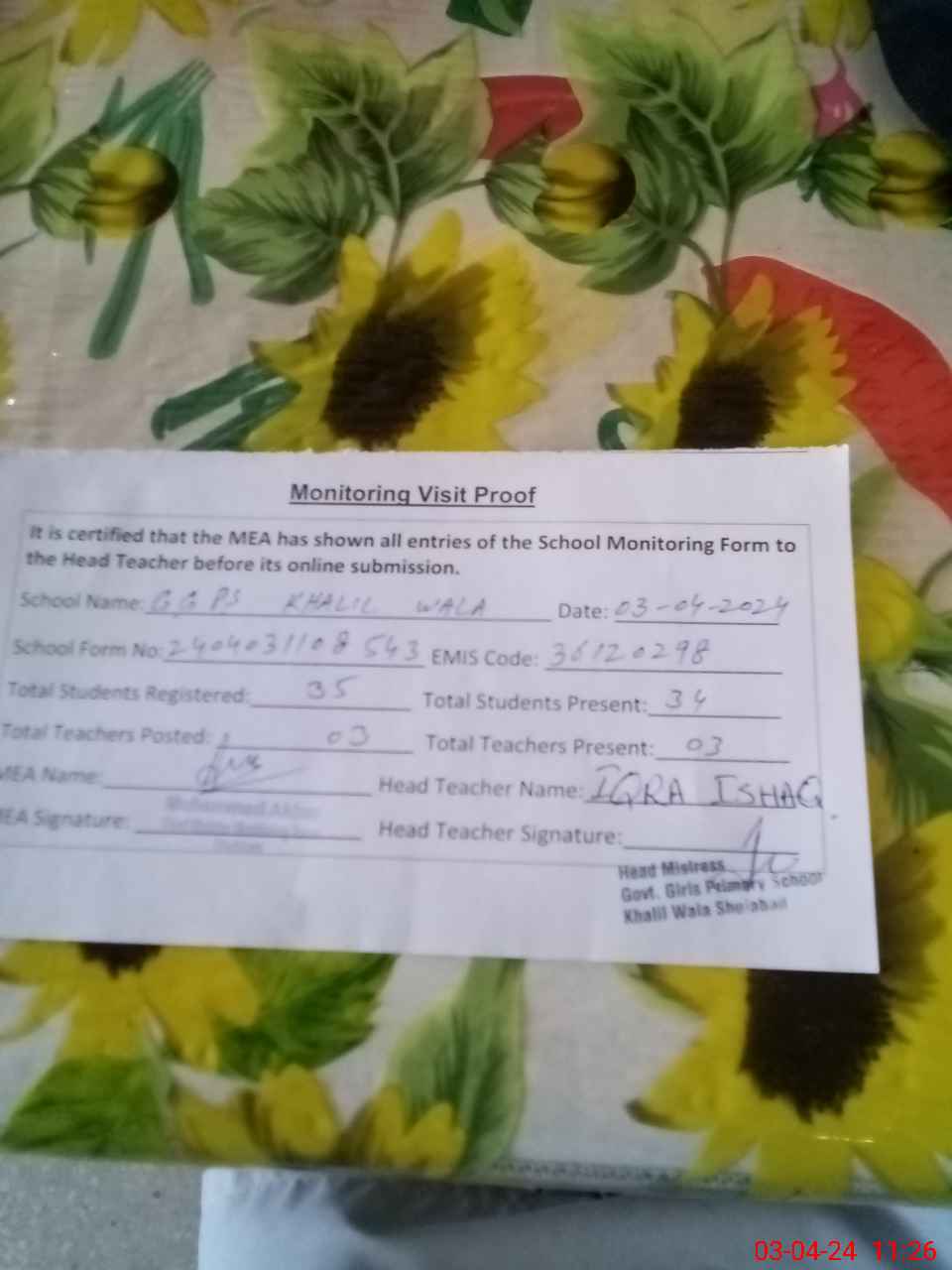 | Attendance Register | Head Teacher | MEA with School | Visit Proof |