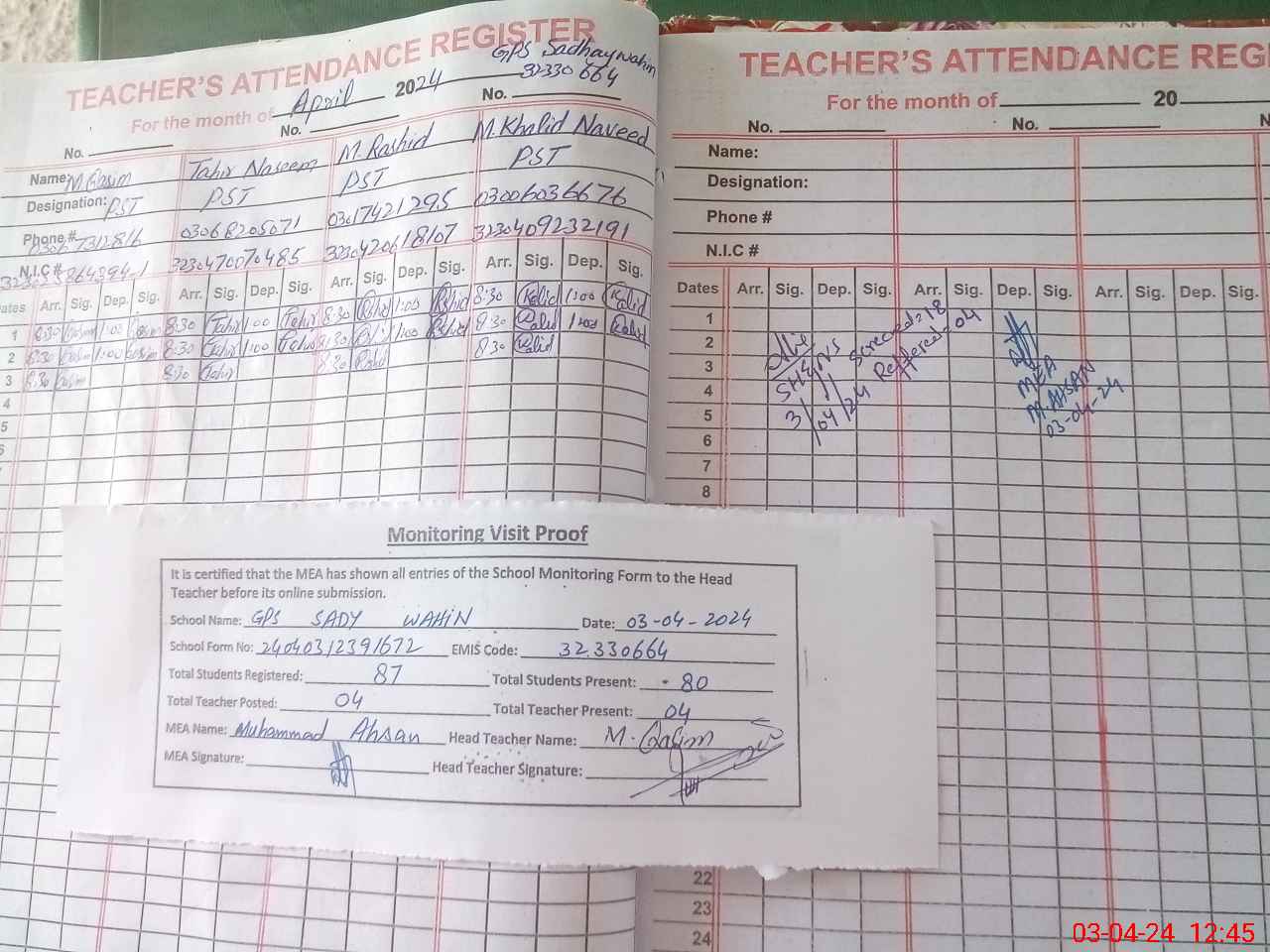 | Attendance Register | Head Teacher | MEA with School | Visit Proof |