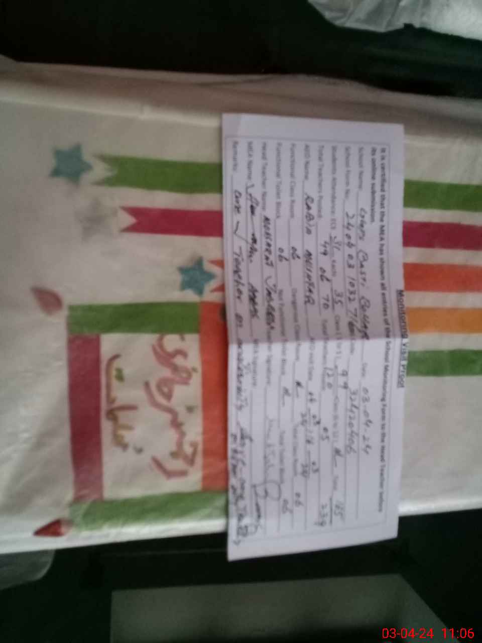 | Remarks (Use Separate Page if Required): ONE teacher on maternity leave one teacher on exam duty overall cleaness good | |||||