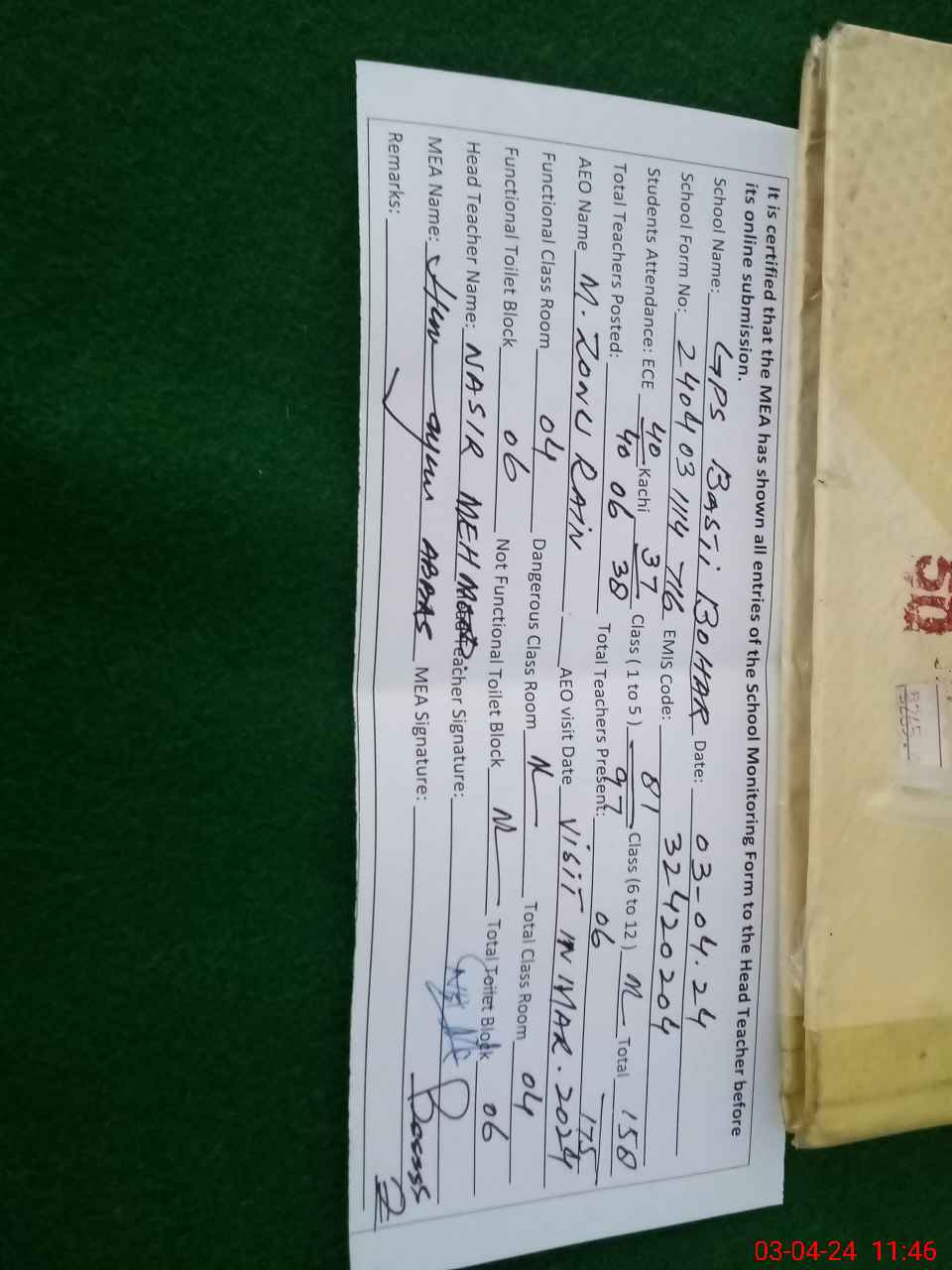| Certified that this School was Inspected by the Undersigned MEA/DMO Today and the Information Stated Above is as Per Record. | |||||