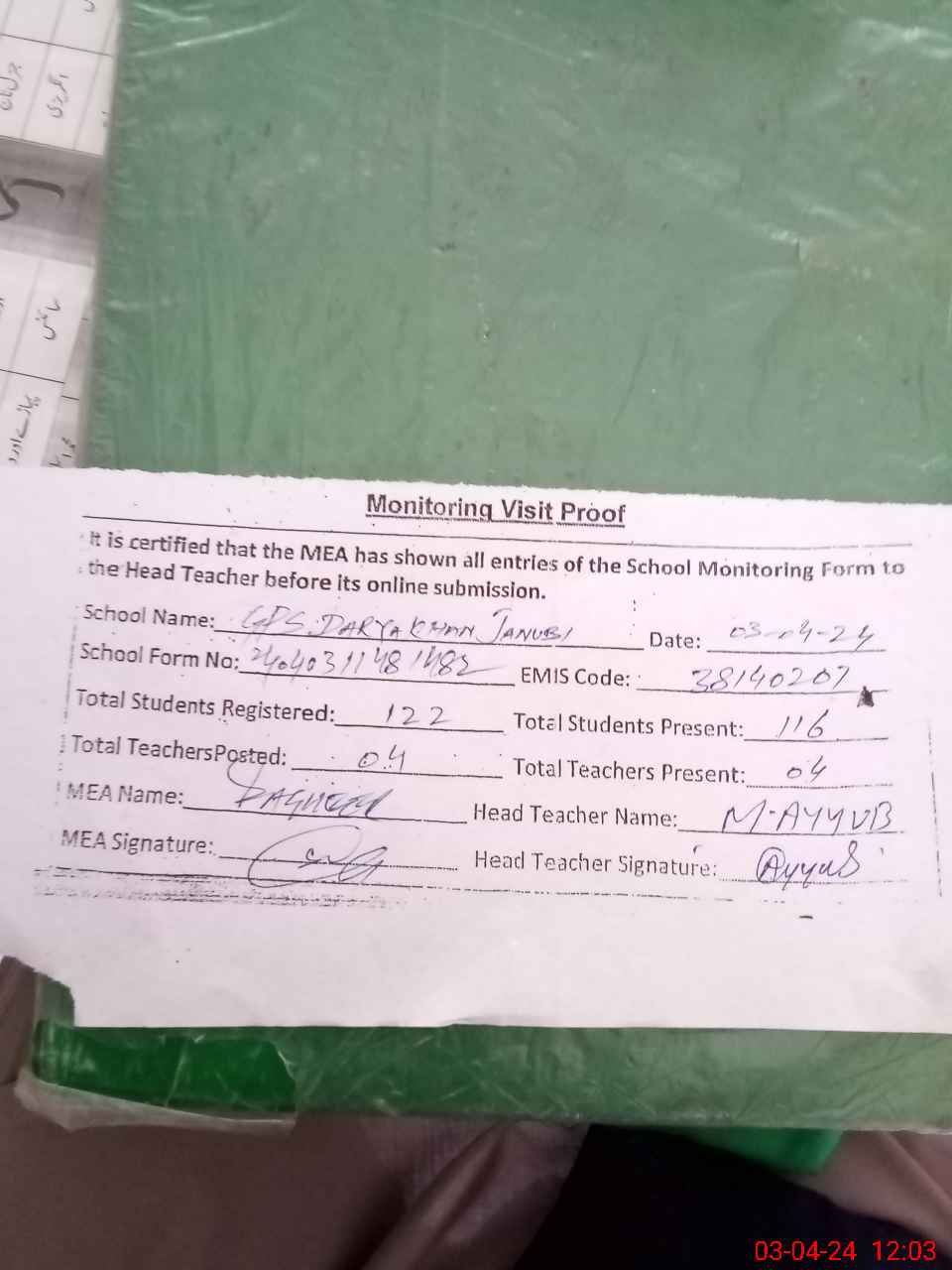 | Attendance Register | Head Teacher | MEA with School | Visit Proof |
