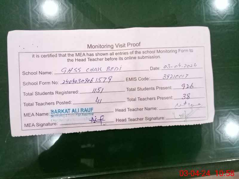 | EMIS Code: 39210017 | Name of School: GHSS CHAK BEDI | |||