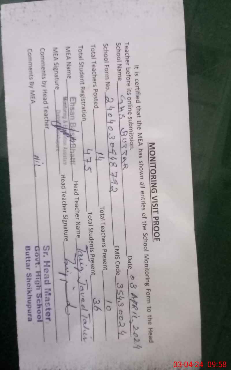 | EMIS Code: 35430024 | Name of School: GHS BUTTAR | |||