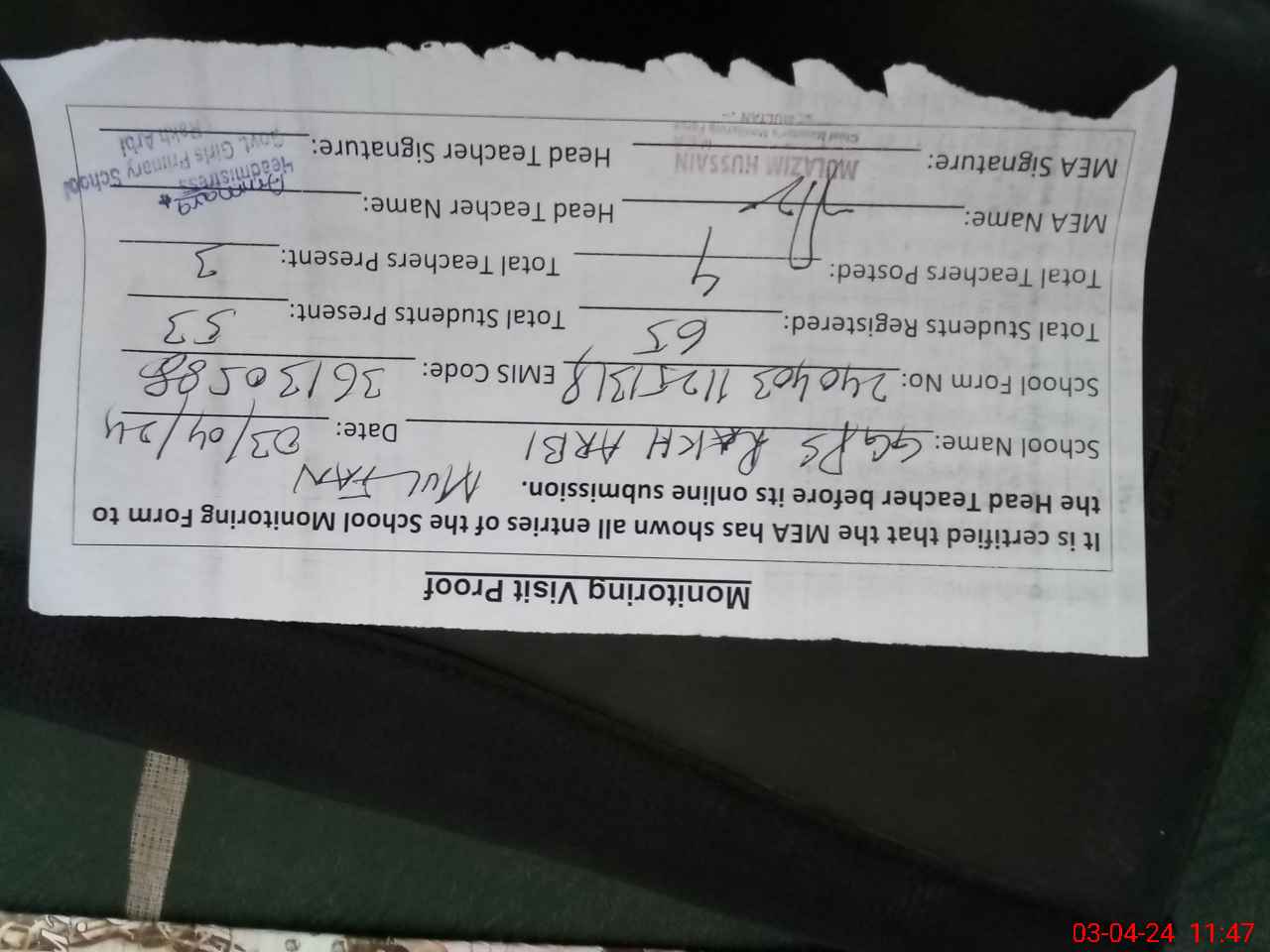 | Attendance Register | Head Teacher | MEA with School | Visit Proof |