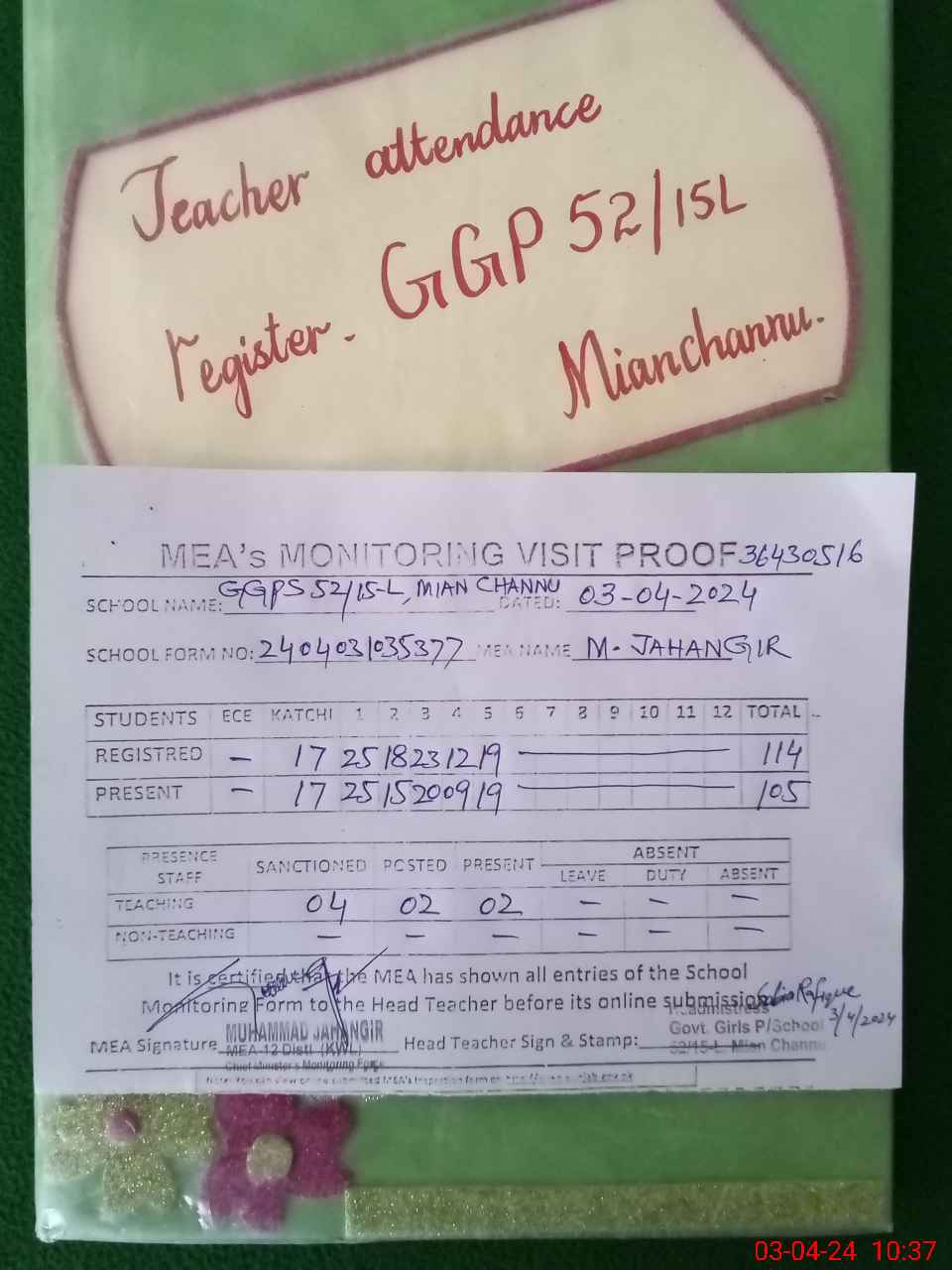 | Attendance Register | Head Teacher | MEA with School | Visit Proof |