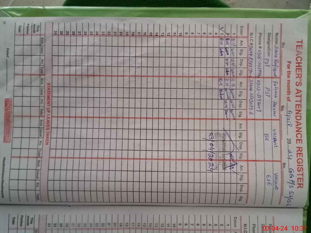 | Name: SO**** RA**** Designation: (School Headmaster's/Headmistress's) PST Phone/Cell Number: 03**** |
