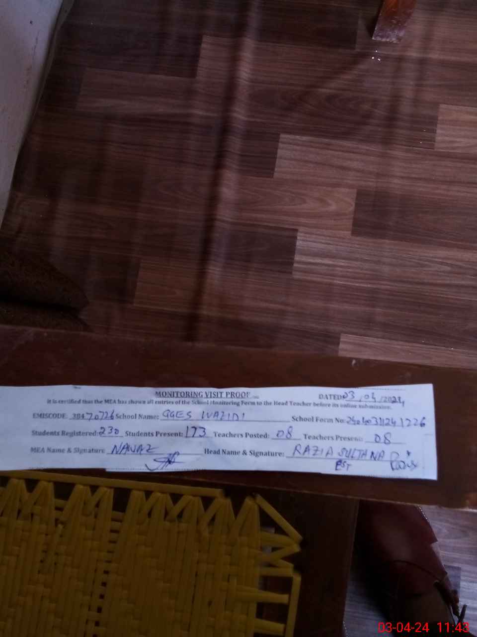 | Attendance Register | Head Teacher | MEA with School | Visit Proof |