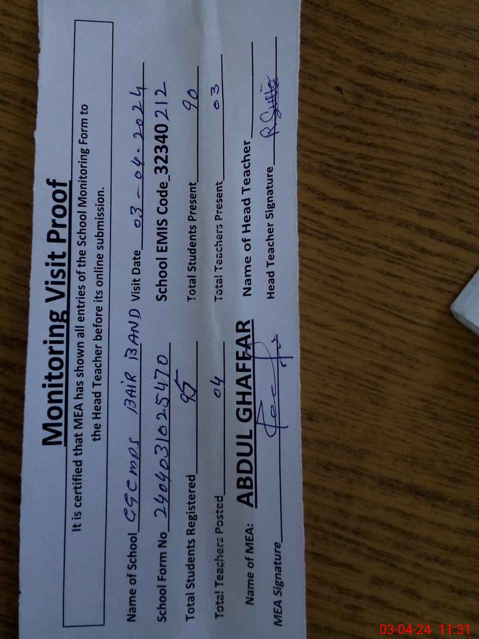 | Attendance Register | Head Teacher | MEA with School | Visit Proof |