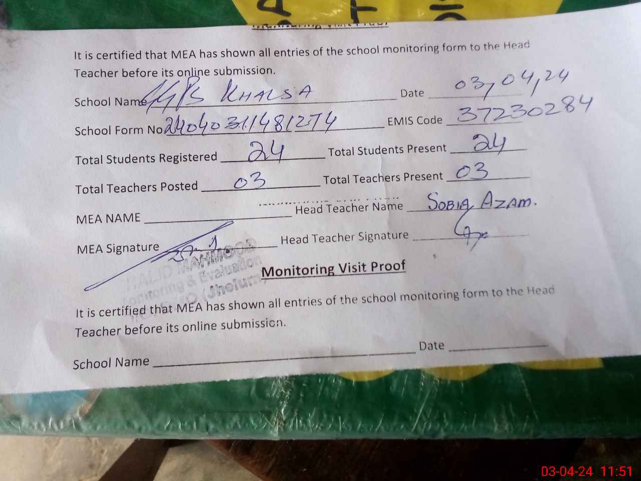| Attendance Register | Head Teacher | MEA with School | Visit Proof |