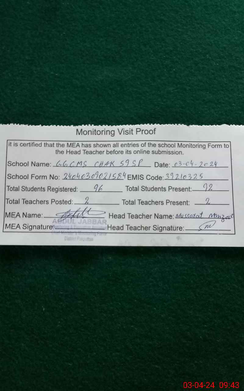 | EMIS Code: 39210325 | Name of School: GGCMS CHAK 59 SP | |||