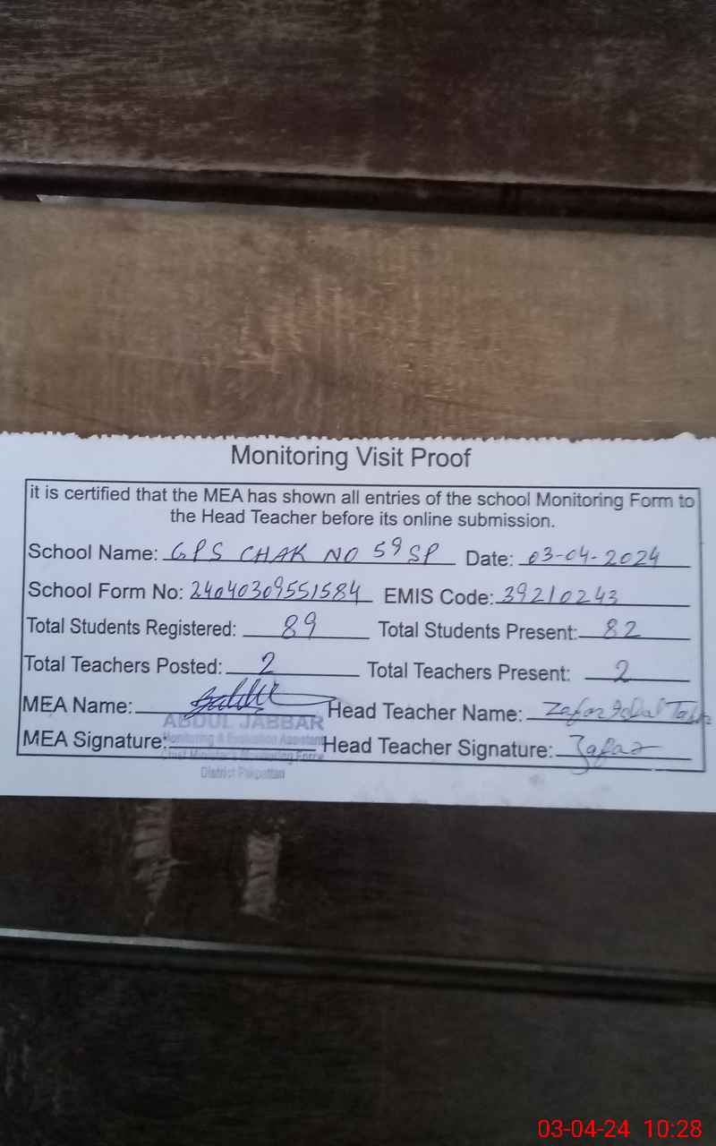 | EMIS Code: 39210243 | Name of School: GPS CHAK NO. 59 / SP | |||