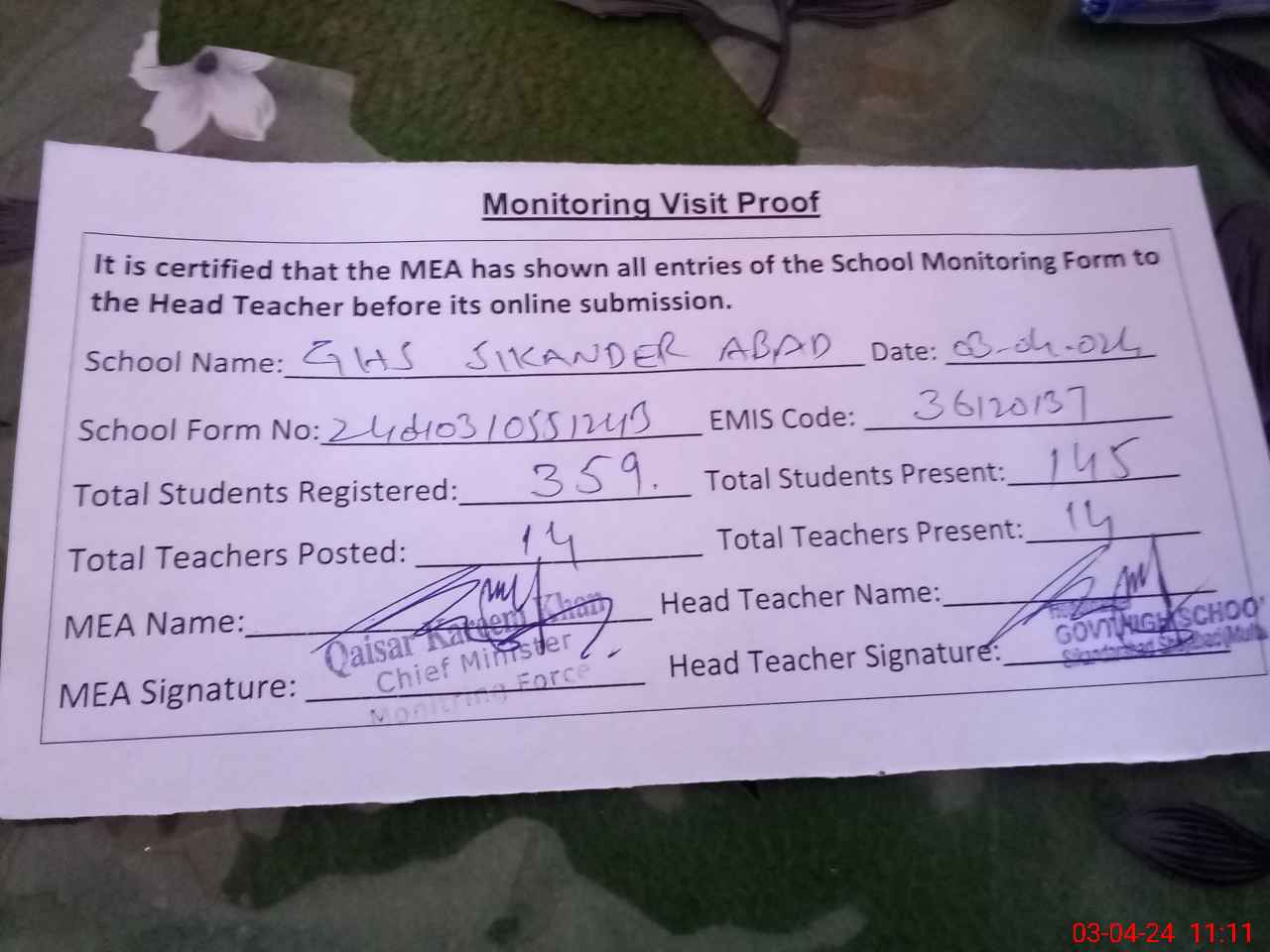 | EMIS Code: 36120137 | Name of School: GHS SIKANDER ABAD SHUJABAD | |||