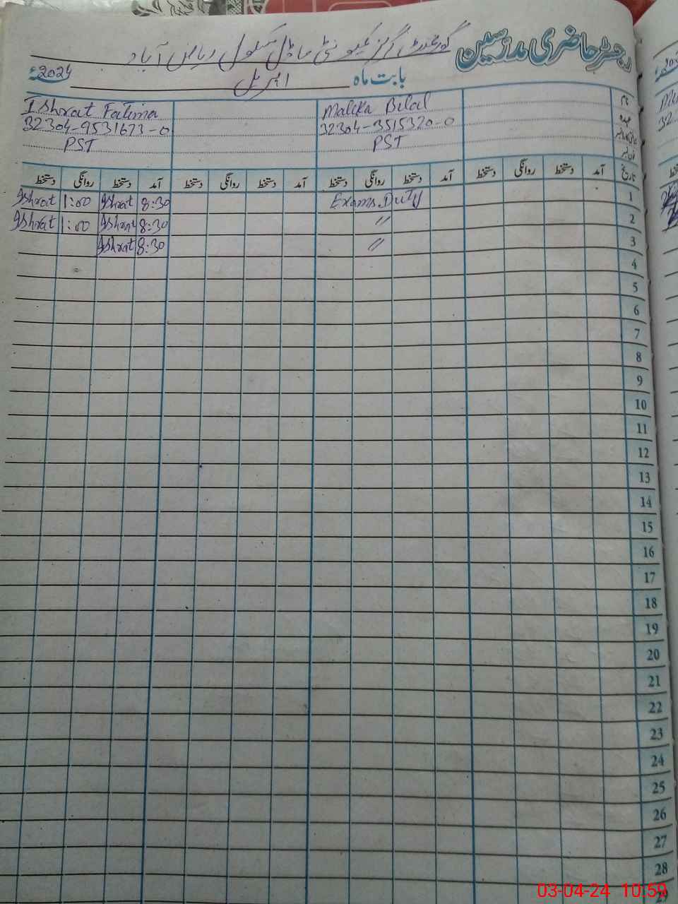 | 32**** | Ma**** Bi**** | PST | Regular | 0 | 31 | 0 | 0 | 0 | 0 | 0 | 0 | 0 | Exam Duty |