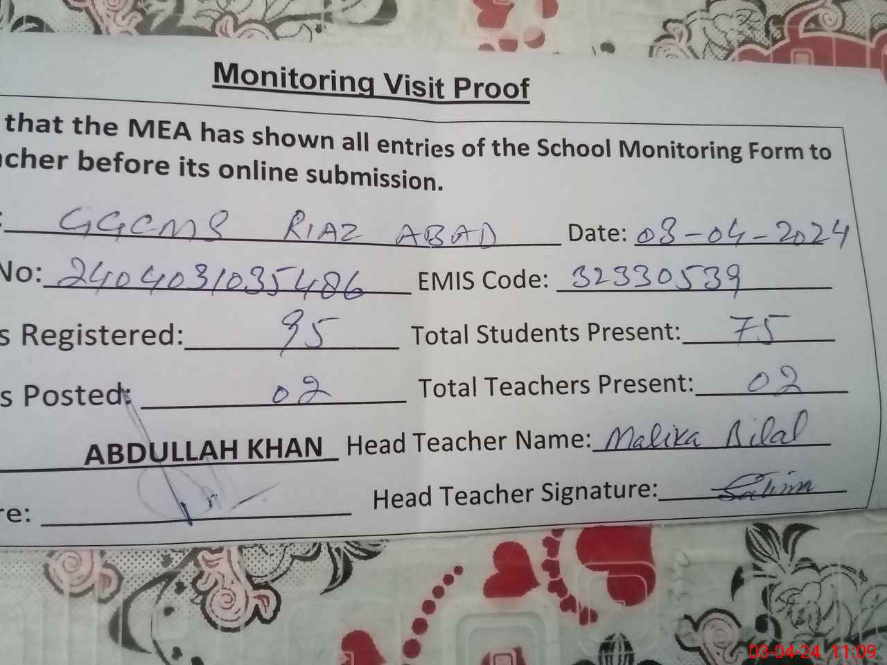 | Monitoring Date: 03-04-2024 | Start Time: 03-04-2024 10:35 AM | End Time: 03-04-2024 11:10 AM | Name of MEA: Ab**** Kh**** | |