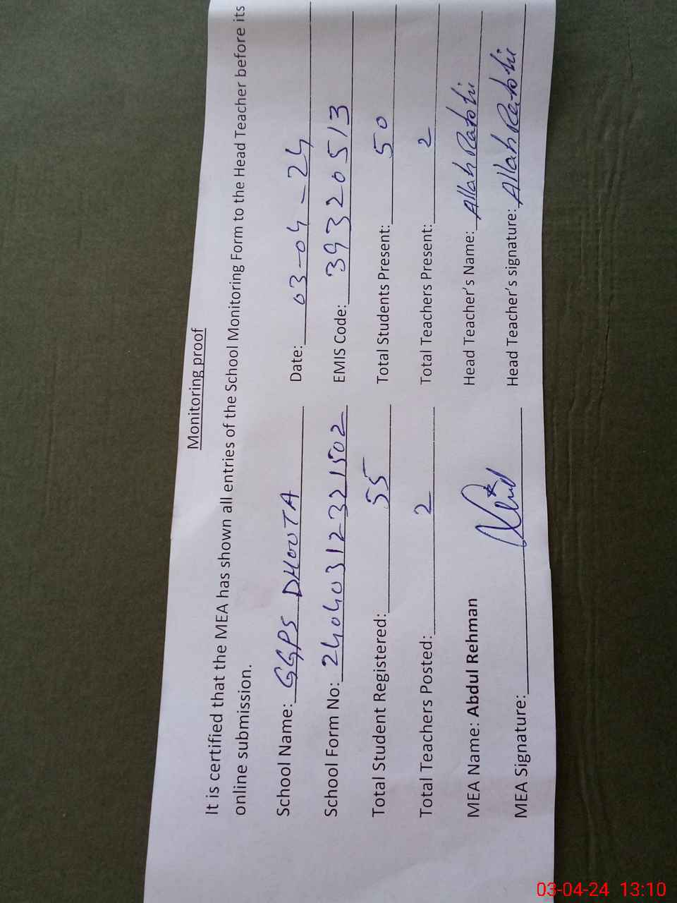 | Attendance Register | Head Teacher | MEA with School | Visit Proof |