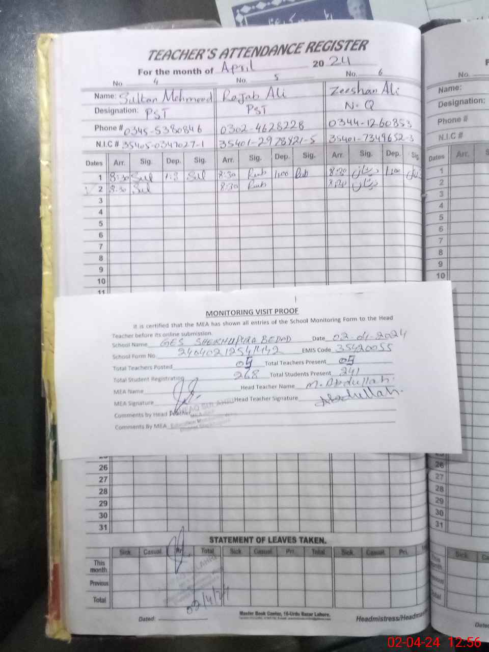 | Attendance Register | Head Teacher | MEA with School | Visit Proof |