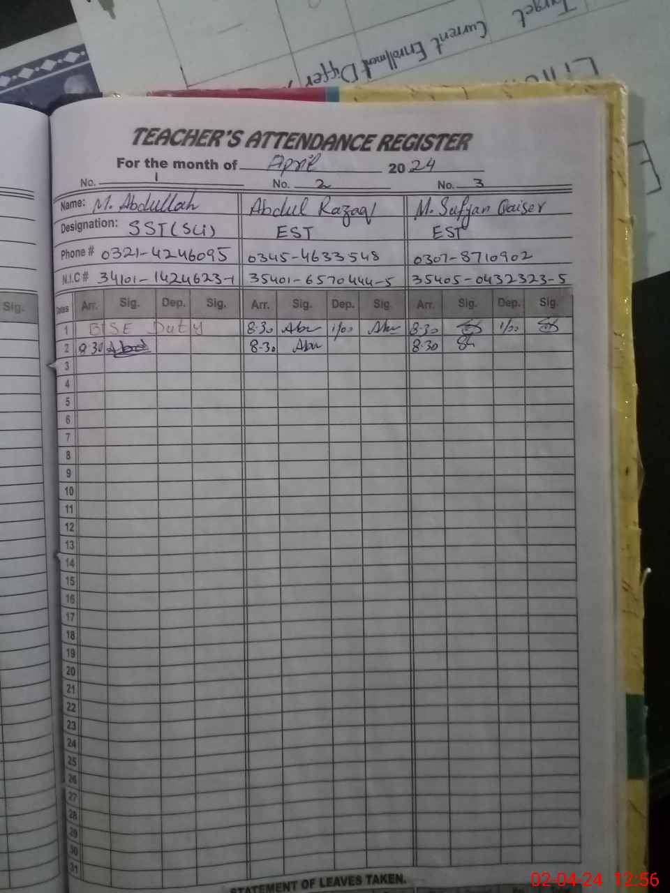| CNIC | Full Name | Designation | R/C | Absence During Last Calender Month |
