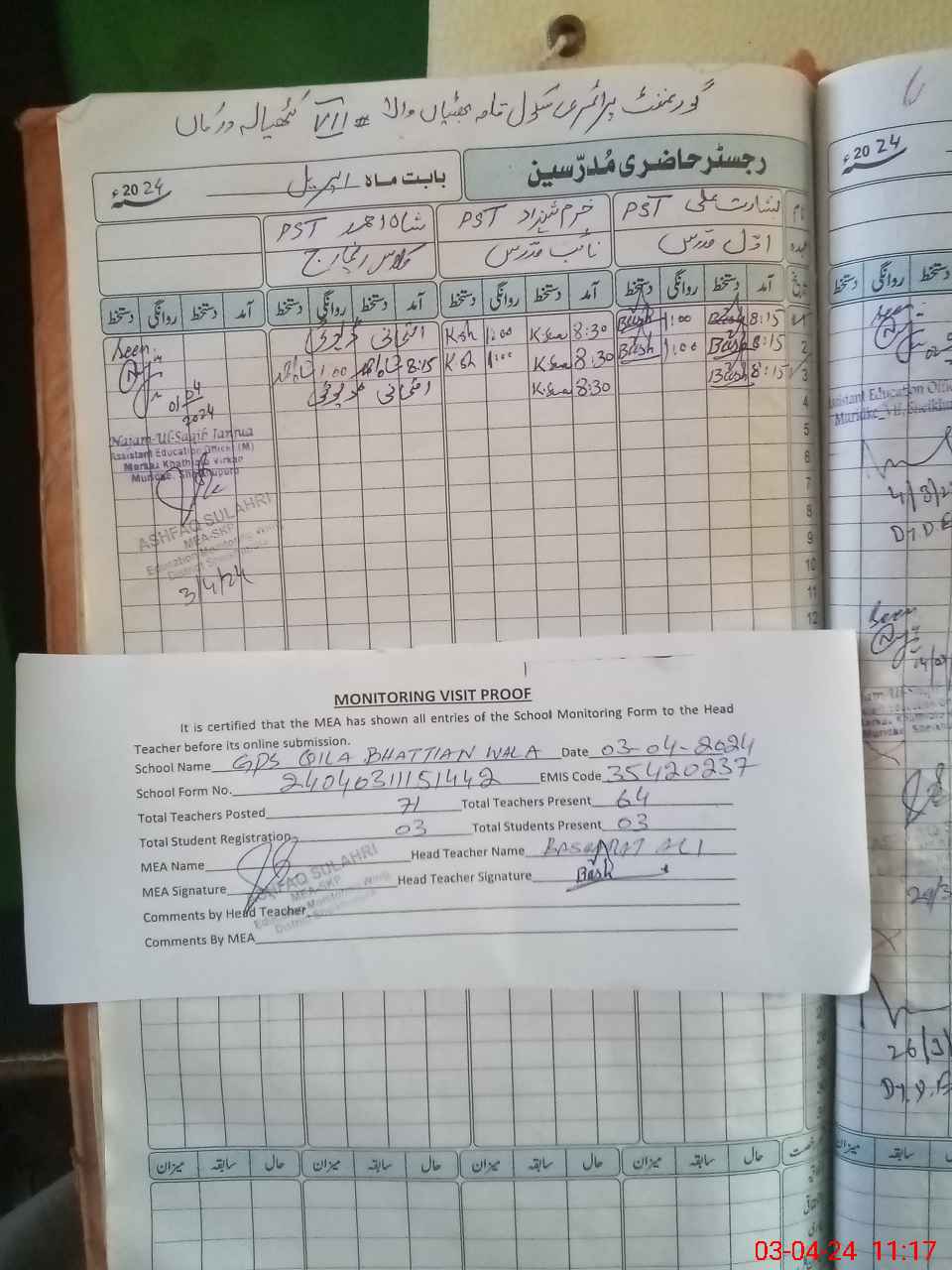 | Attendance Register | Head Teacher | MEA with School | Visit Proof |