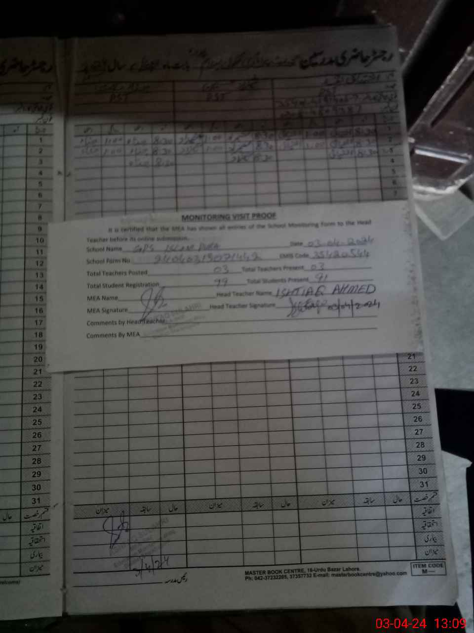 | Attendance Register | Head Teacher | MEA with School | Visit Proof |