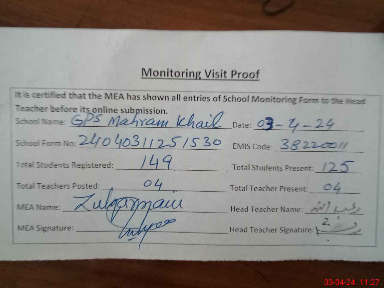 | EMIS Code: 38220011 | Name of School: GPS MAHRAM KHAIL | |||