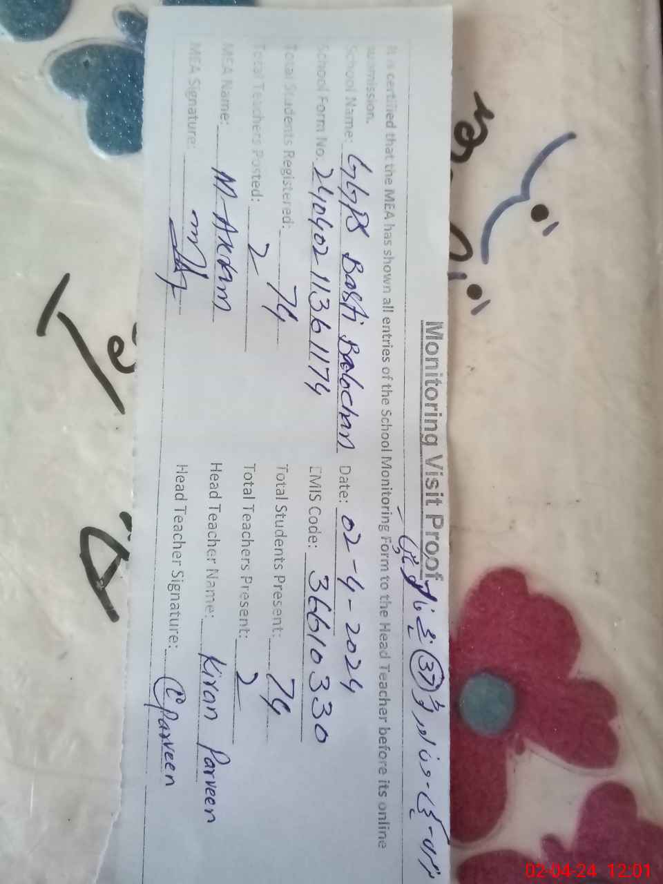 | Attendance Register | Head Teacher | MEA with School | Visit Proof |