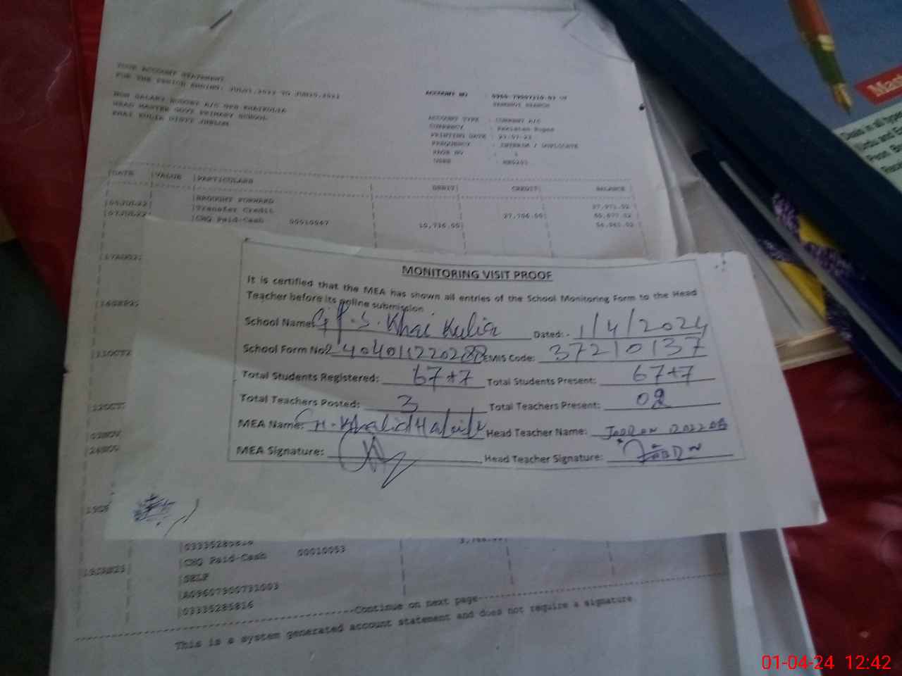 | Attendance Register | Head Teacher | MEA with School | Visit Proof |