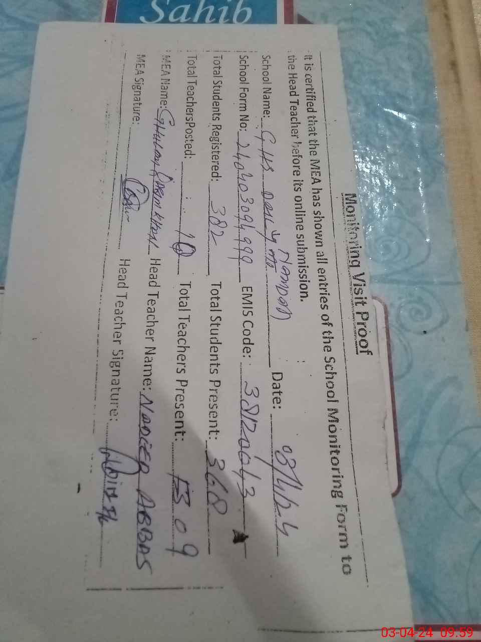 | EMIS Code: 38120043 | Name of School: GHS DAILY NAMDAR | |||