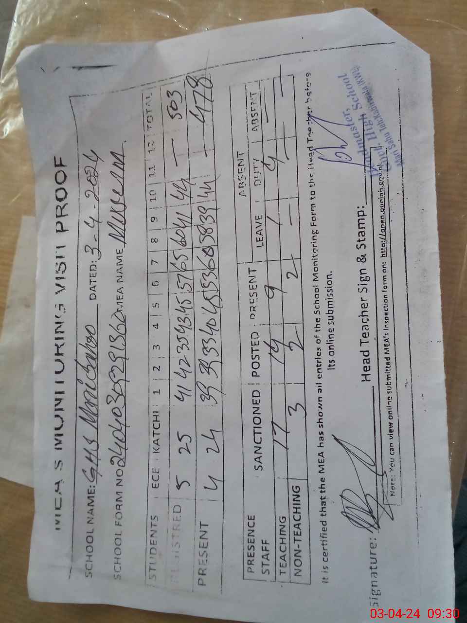 | Attendance Register | Head Teacher | MEA with School | Visit Proof |