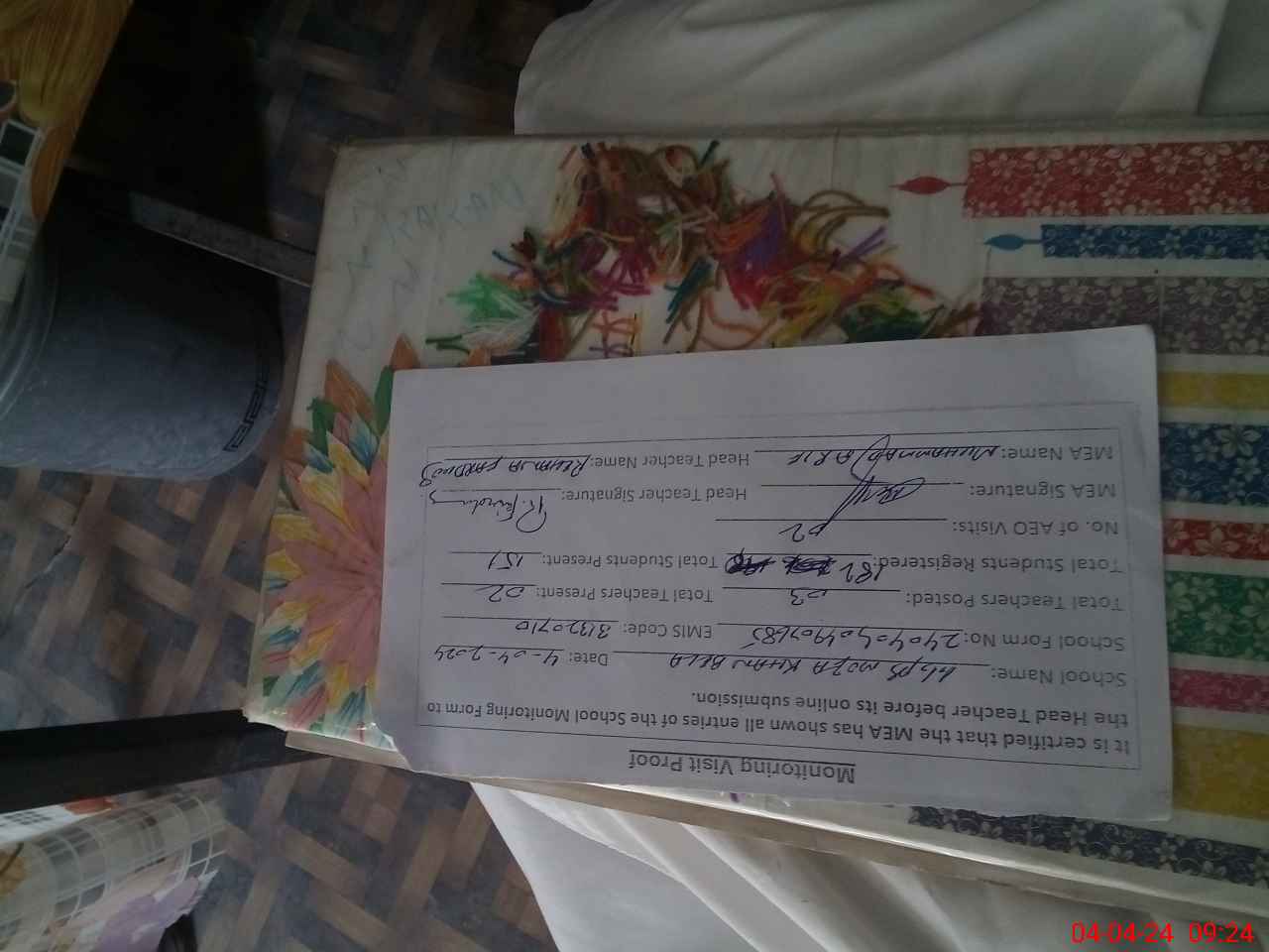 | Attendance Register | Head Teacher | MEA with School | Visit Proof |