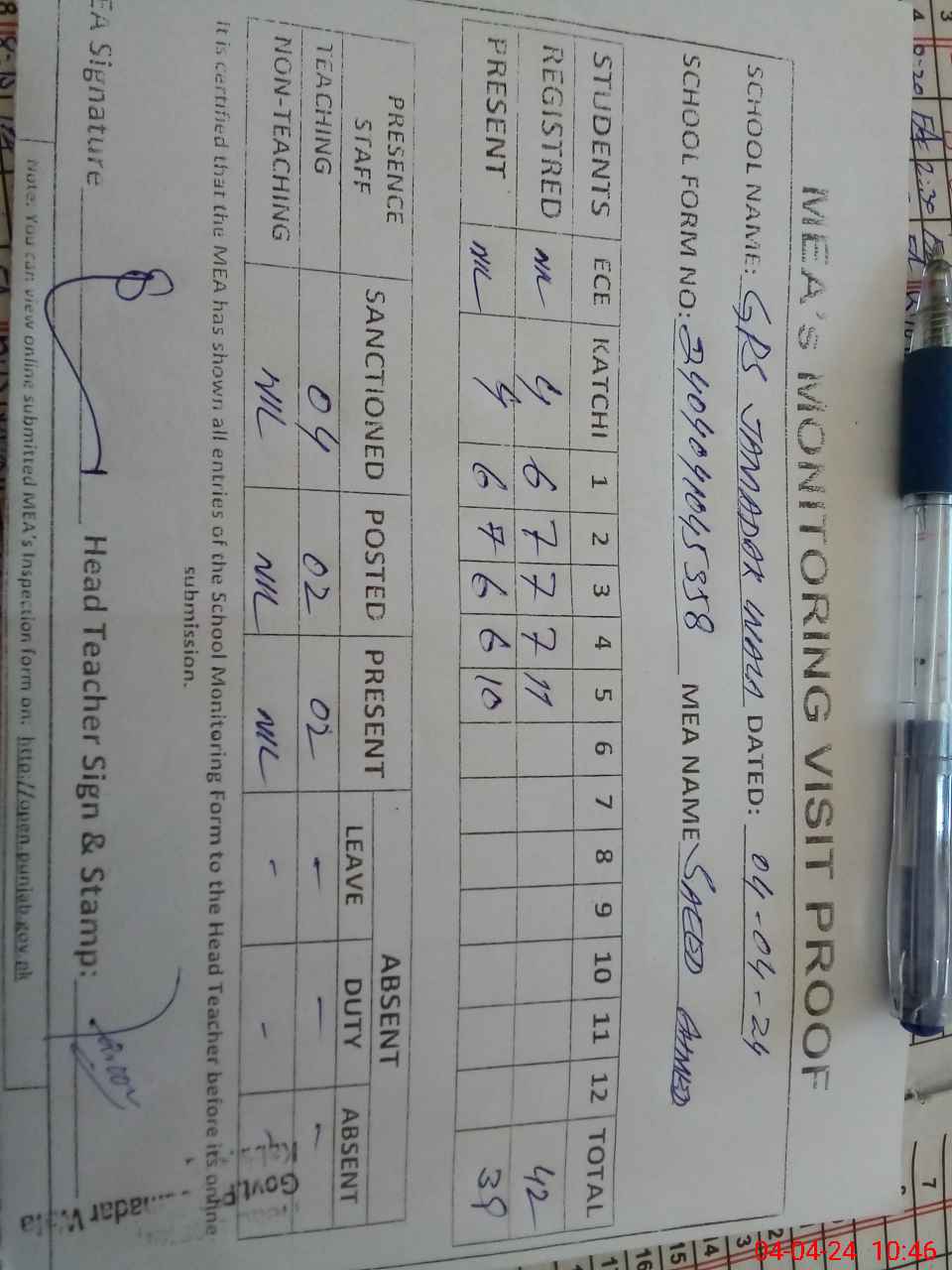 | Attendance Register | Head Teacher | MEA with School | Visit Proof |