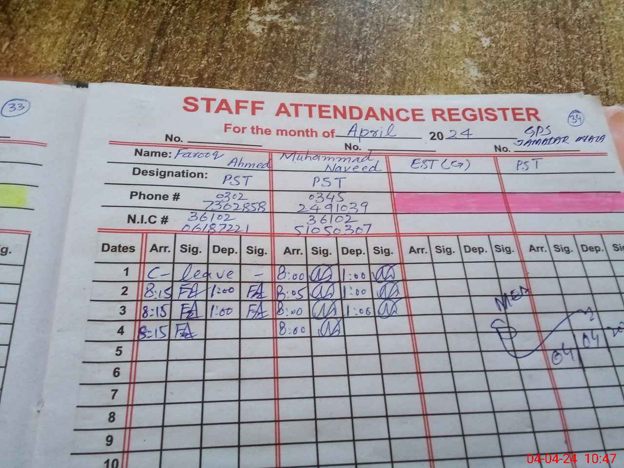 | CNIC | Full Name | Designation | R/C | Absence During Last Calender Month |