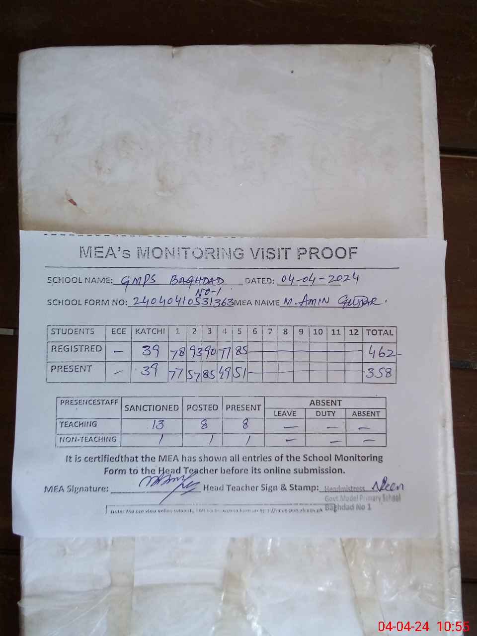 | Attendance Register | Head Teacher | MEA with School | Visit Proof |