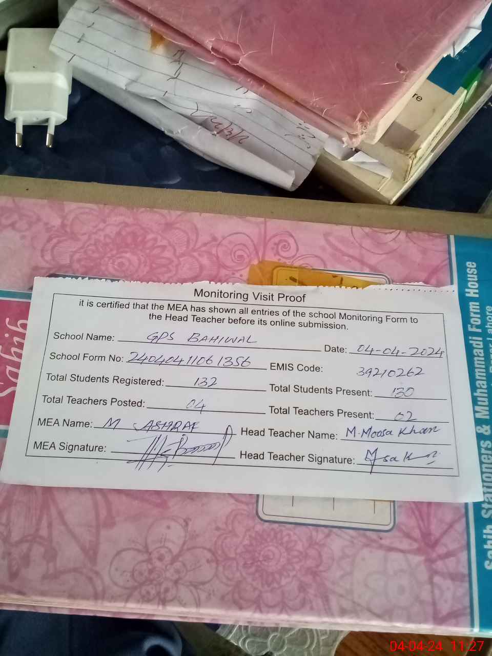 | EMIS Code: 39210262 | Name of School: GPS BAHIWAL | |||