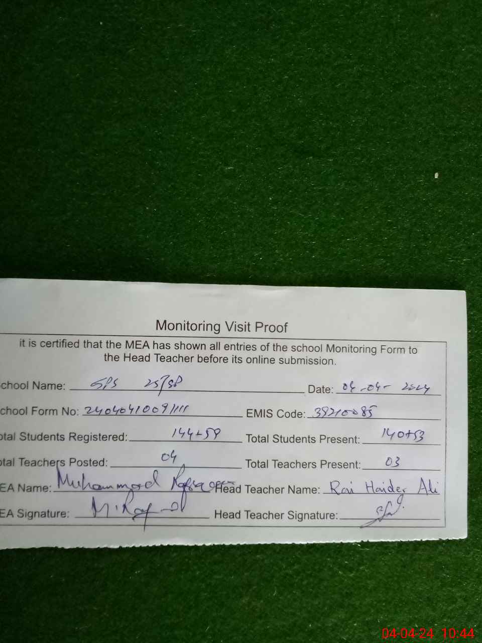 | Monitoring Date: 04-04-2024 | Start Time: 04-04-2024 10:09 AM | End Time: 04-04-2024 10:46 AM | Name of MEA: Mu**** Ra**** | |