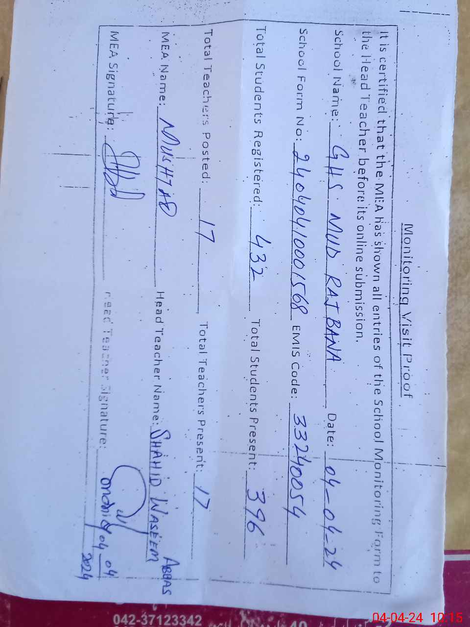 | EMIS Code: 33240054 | Name of School: GHS MUD RAJBANA | |||