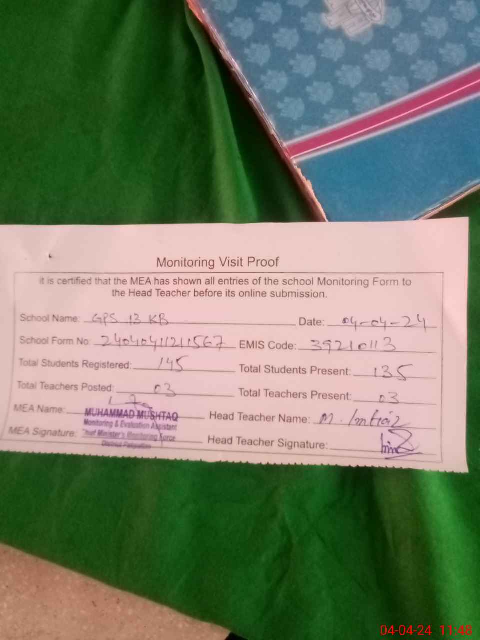 | Attendance Register | Head Teacher | MEA with School | Visit Proof |